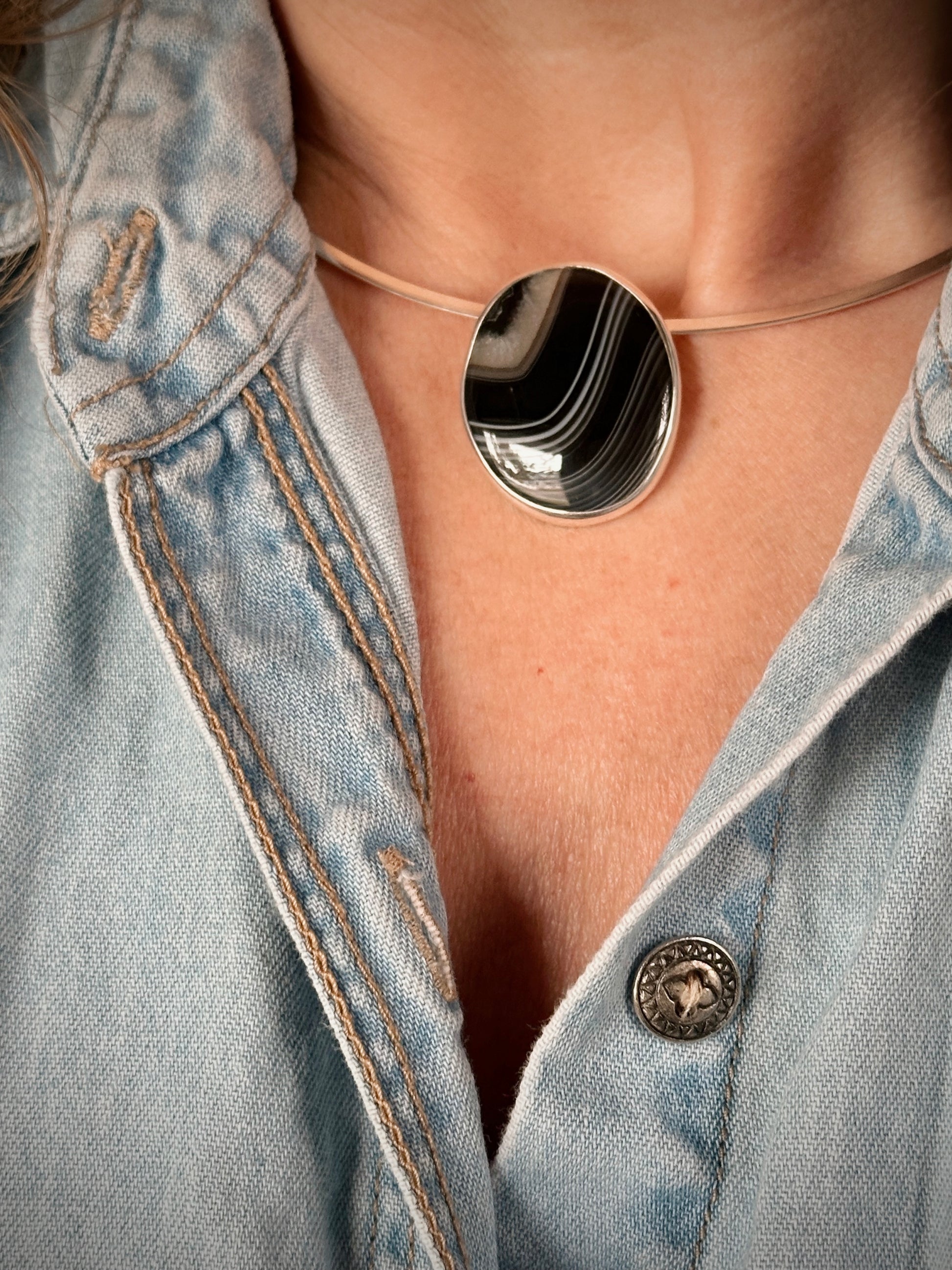 Striking Banded Agate is set in fine and sterling silver. It has a hidden bail and slides freely on a sterling silver flat wire collar. The collar measure 15" around with a 2.25" chain extender allowing for an adjustable fit.