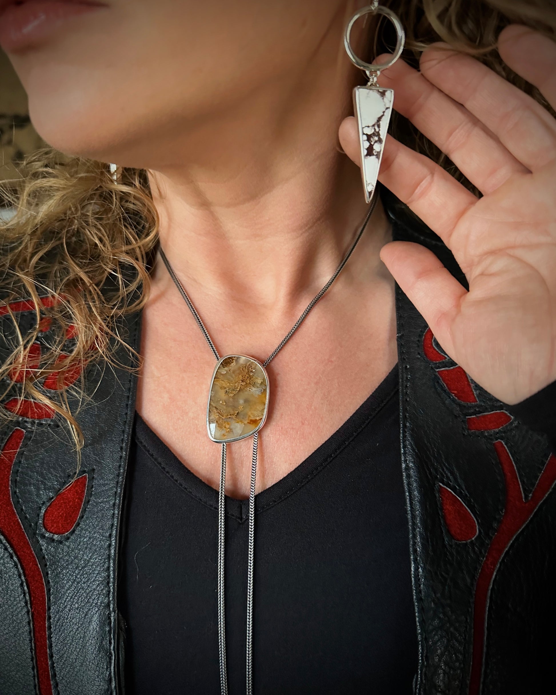 A freeform, hand-cut piece of Graveyard Point Plume Agate is set in heavy fine silver with a sterling silver backplate. The pendant slides freely along an oxidized sterling silver chain, finished with my original silver nugget bolo tips. Cut and shaped in-house, this piece is truly one-of-a-kind. The agate was mined in the Owyhee Mountains along the Oregon–Idaho border, a region celebrated for stones that capture their own internal worlds. The plume formations of manganese and iron oxide create an effect that feels both ancient and alive.