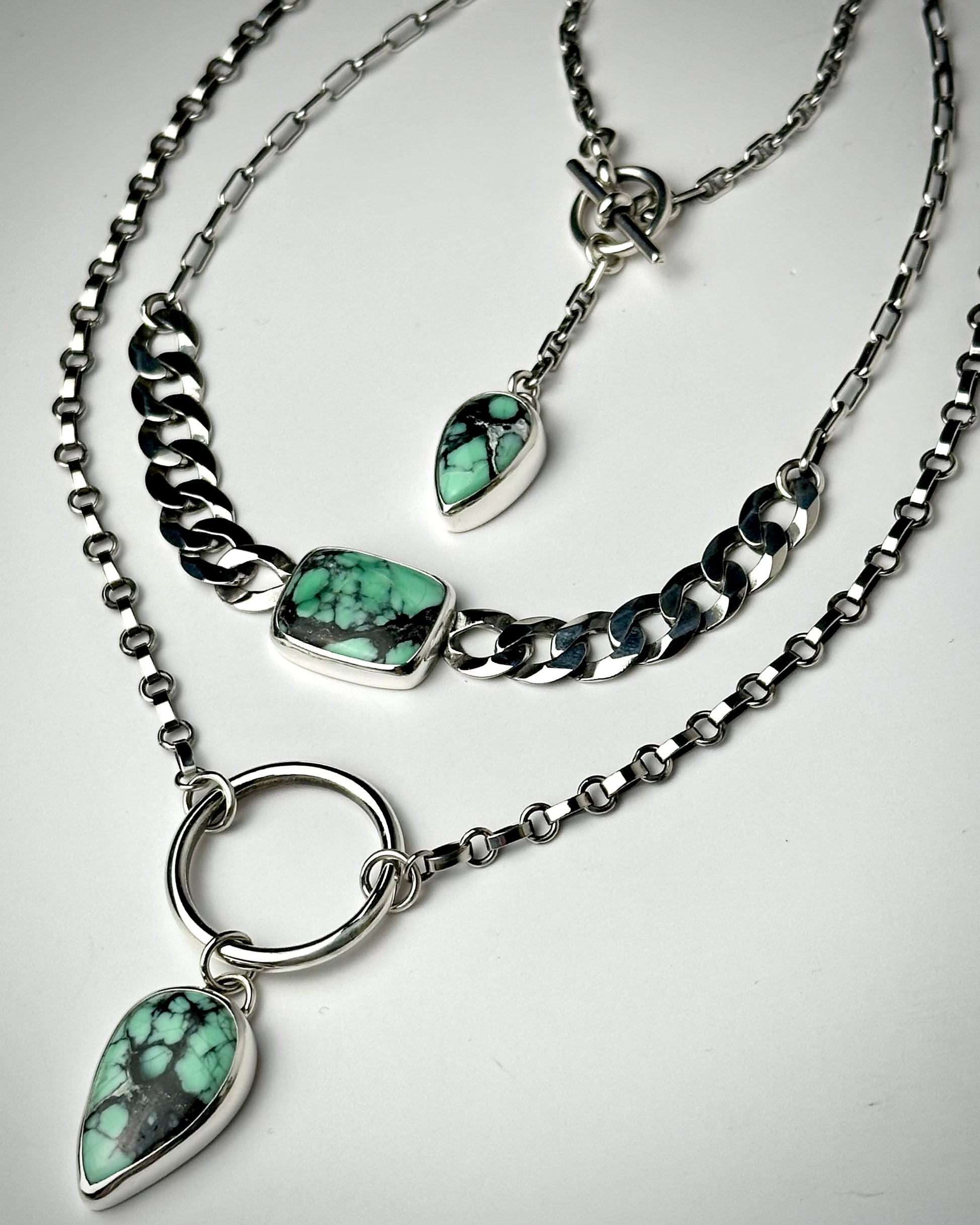 One-Of-A-Kind mixed chain sterling silver collar featuring a striking Emerald Rose Variscite stone. The hand-cut Variscite cabochon is set in fine and sterling silver, fixed between heavy sterling silver curb chain and oval curb chain.