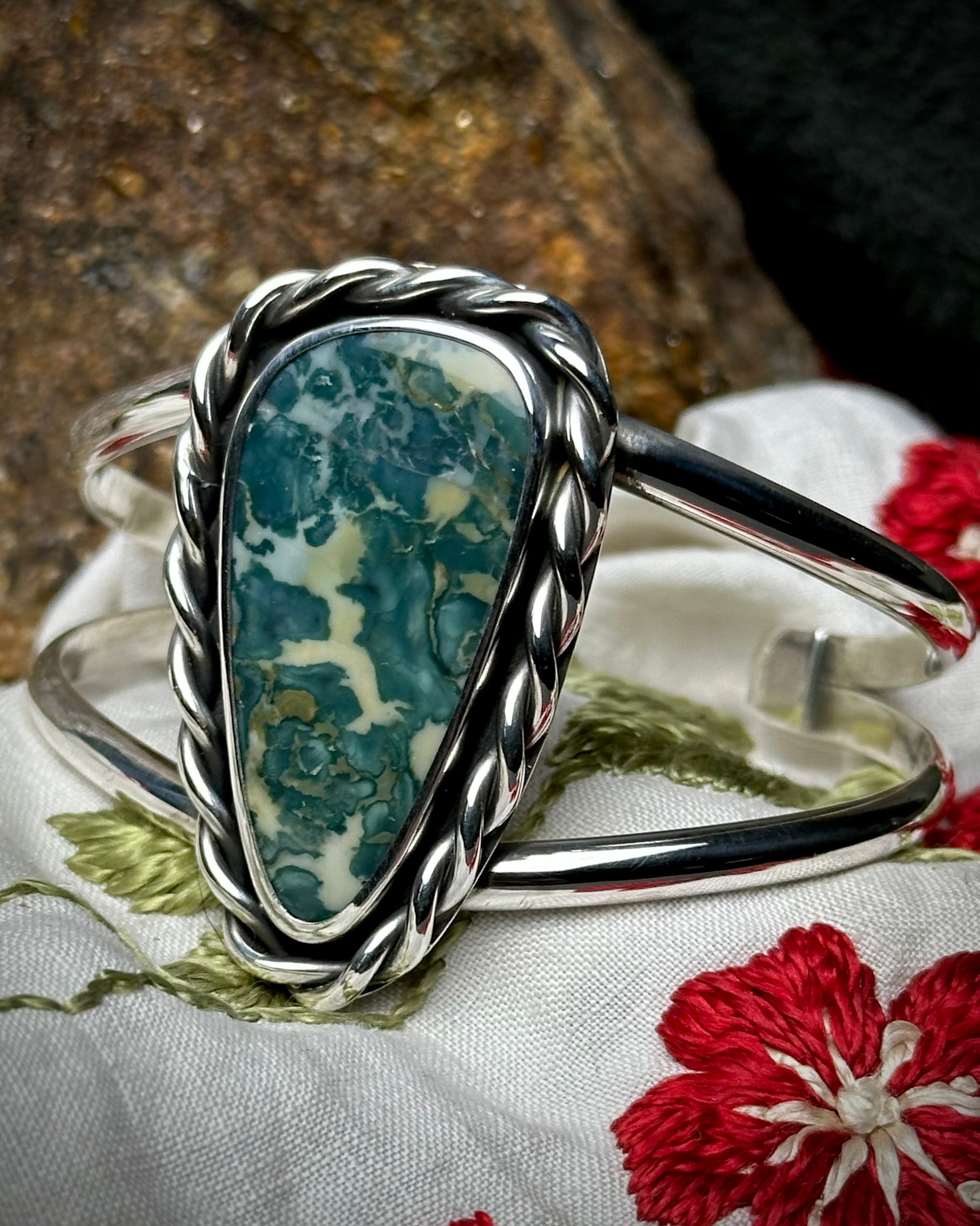 A new Jasper from the Owyhee area boasts a mesmerizing patterns of blues and greens. The stone was hand cut in house and one-of-a-kind. It is set in fine silver with a sterling silver infinity border. On an open double banded cuff, it easily stands out.