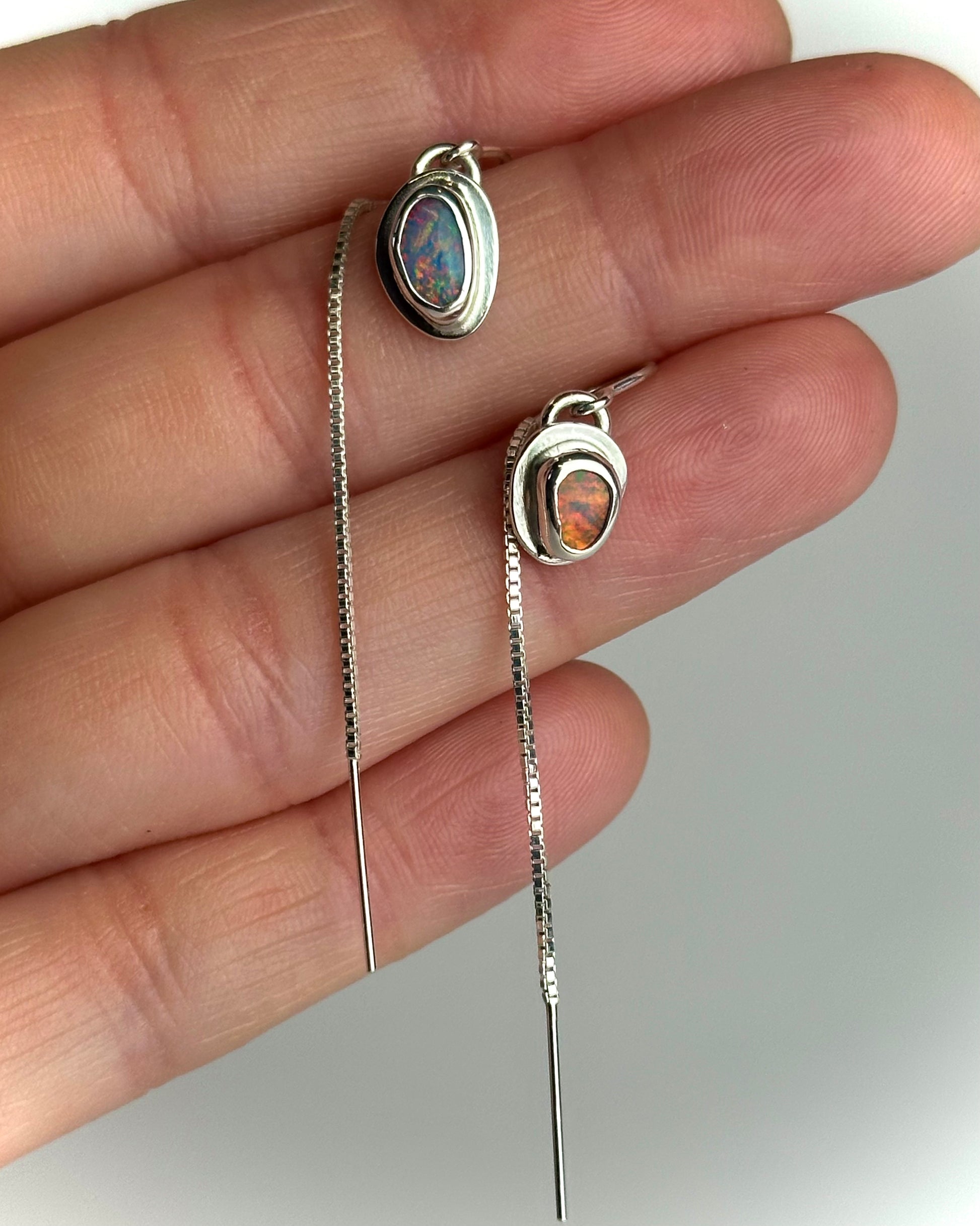 A pair of sterling silver threaders featuring Coober Pedy opals with bold flashes of pink and periwinkle. Each stone is bezel set by hand in fine and sterling silver and hangs from a classic box chain that threads comfortably through the ear.